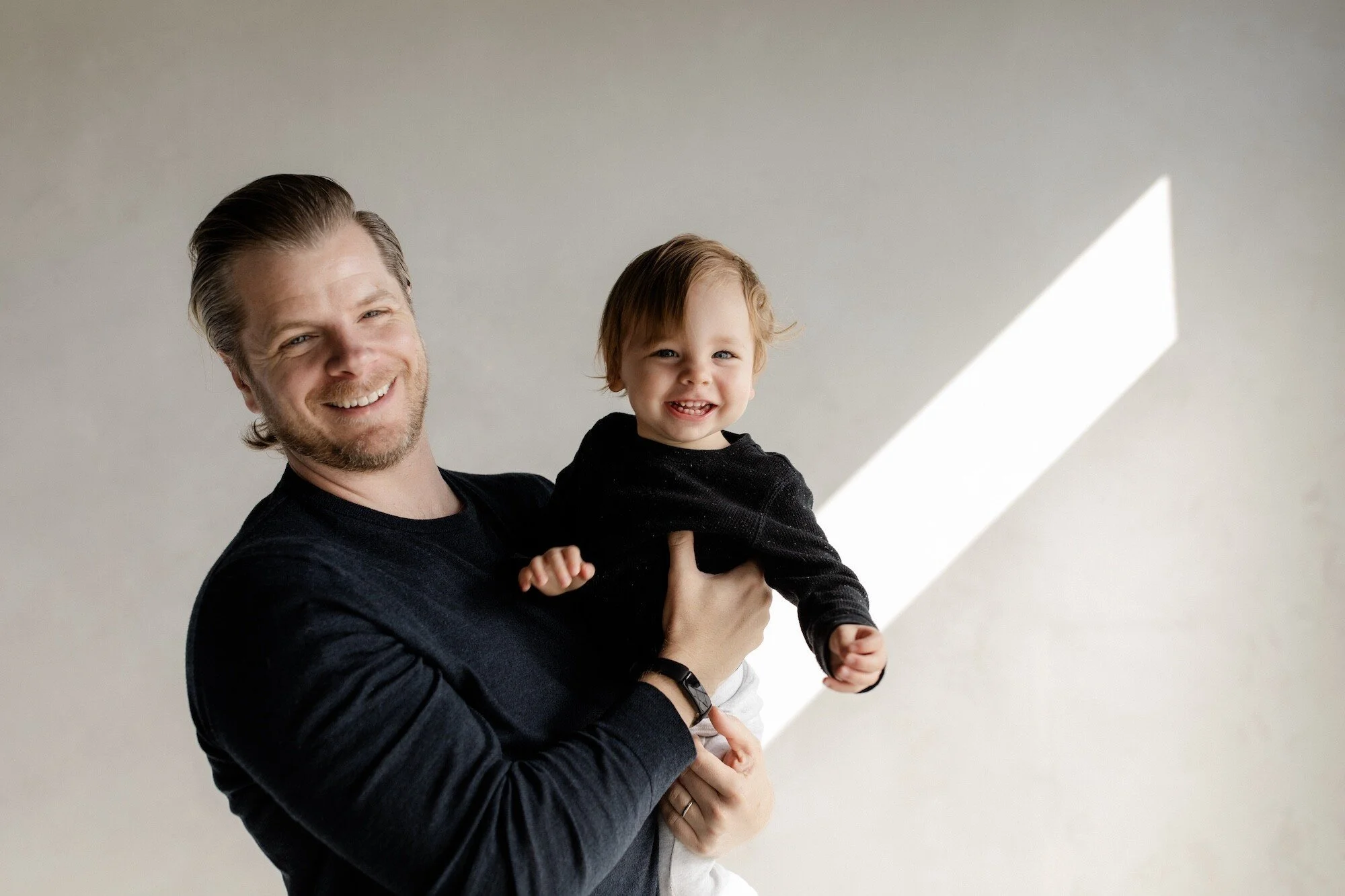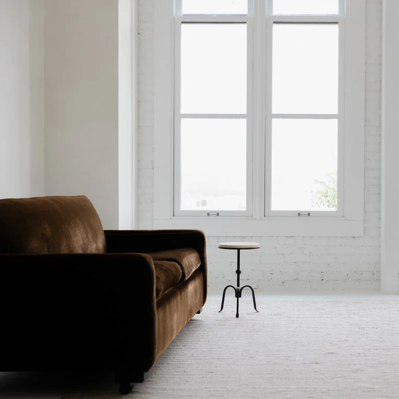 Fall mini sessions at Loft Studio in Tacoma are for families, individuals, and of all types and ages. The space is clean and simple with a couple curated accents, like a limewash wall and velvet couch.